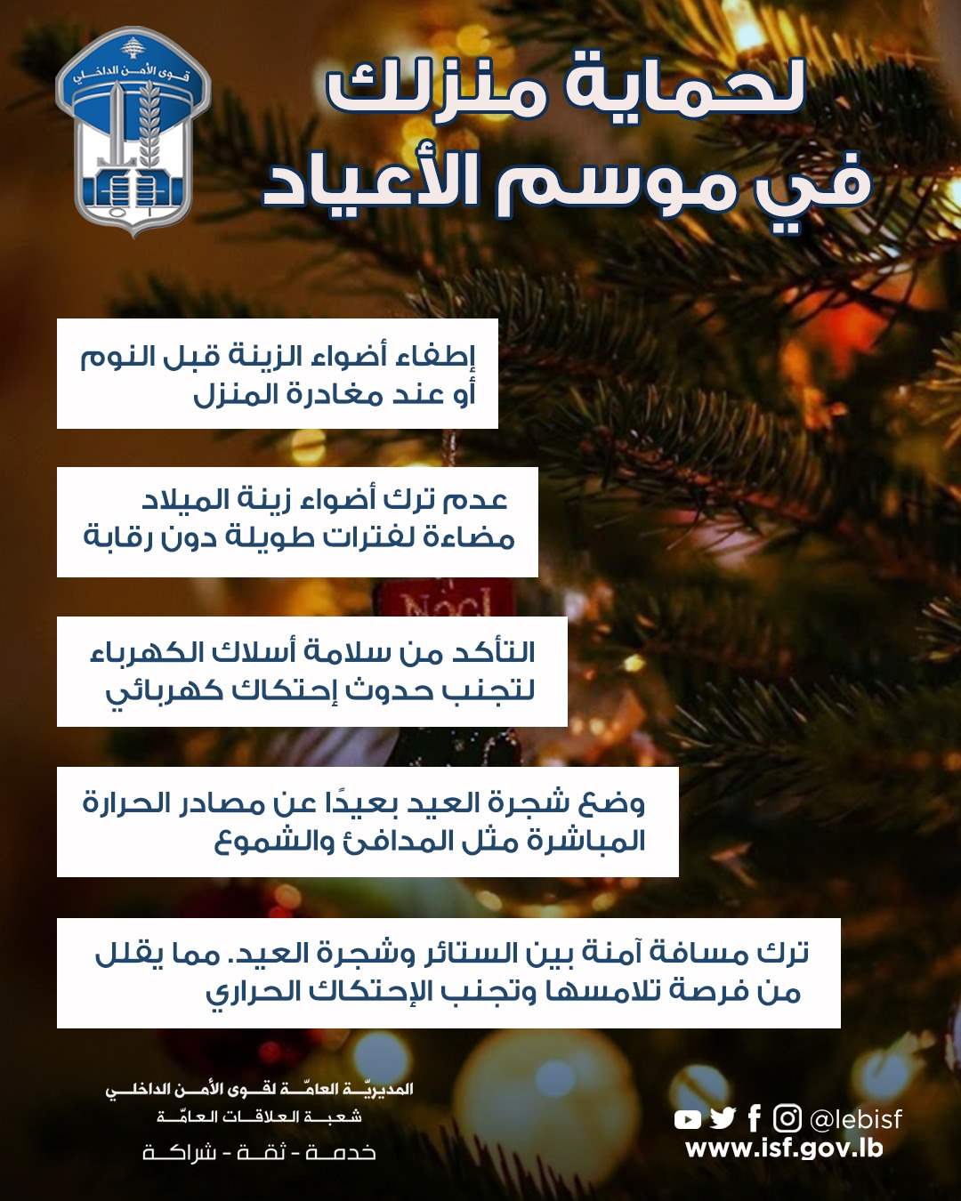 نشرت المديرية العامة لقوى الأمن الداخلي – شعبة العلاقات العامة، عبر حسابها على منصة “إكس”، صورة وعلّقت عليها كاتبة: “الإجراءات الواجب اتباعها لإضاءة شجرة الميلاد بطريقة آمنة تضمن حماية منزلك من مخاطر الحرائق خلال موسم الأعياد”.